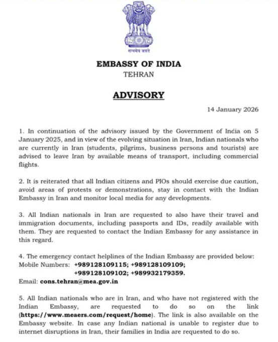 ਭਾਰਤ ਦੇ ਵਿਦੇਸ਼ ਮੰਤਰਾਲੇ (MEA) ਨੇ ਇਰਾਨ ਵਿੱਚ ਰਹਿ ਰਹੇ ਸਾਰੇ ਭਾਰਤੀ ਨਾਗਰਿਕਾਂ ਨੂੰ ਆਪਣੇ ਪਾਸਪੋਰਟ, ਵੀਜ਼ਾ ਅਤੇ ਹੋਰ ਜ਼ਰੂਰੀ ਦਸਤਾਵੇਜ਼ ਤਿਆਰ ਰੱਖਣ ਦੀ ਸਲਾਹ ਦਿੱਤੀ ਹੈ। ਜੇਕਰ ਇੰਟਰਨੈੱਟ ਦੀਆਂ ਦਿੱਕਤਾਂ ਕਾਰਨ ਕੋਈ ਨਾਗਰਿਕ ਖੁਦ ਰਜਿਸਟ੍ਰੇਸ਼ਨ ਨਹੀਂ ਕਰਵਾ ਪਾ ਰਿਹਾ, ਤਾਂ ਭਾਰਤ ਵਿੱਚ ਰਹਿੰਦੇ ਉਨ੍ਹਾਂ ਦੇ ਪਰਿਵਾਰਕ ਮੈਂਬਰ ਦੂਤਾਵਾਸ ਦੀ ਵੈੱਬਸਾਈਟ ‘ਤੇ ਜਾ ਕੇ ਉਨ੍ਹਾਂ ਦੇ ਵੇਰਵੇ ਭਰ ਸਕਦੇ ਹਨ।