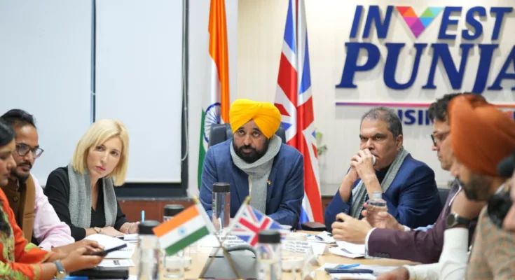 ਬ੍ਰਿਟਿਸ਼ ਡਿਪਟੀ ਹਾਈ ਕਮਿਸ਼ਨਰ ਐਲਬਾ ਸਮੈਰੀਗਲੀਓ ਅਤੇ ਯੂ.ਕੇ. ਨਾਲ ਸਬੰਧਤ ਵੱਖ-ਵੱਖ ਅਤੇ ਬਹੁ-ਕੌਮੀ ਕੰਪਨੀਆਂ ਦੇ ਨੁਮਾਇੰਦਿਆਂ ਨਾਲ ਮੁਲਾਕਾਤ ਦੌਰਾਨ ਮੁੱਖ ਮੰਤਰੀ ਨੇ ਕਿਹਾ ਕਿ ਪੰਜਾਬ ਰਵਾਇਤੀ ਅਤੇ ਨਵੇਂ ਉੱਭਰ ਰਹੇ ਖੇਤਰਾਂ ਵਿੱਚ ਯੂ.ਕੇ. ਨਾਲ ਮਜ਼ਬੂਤ ਕਾਰੋਬਾਰੀ ਸਬੰਧਾਂ ਦੀ ਸਾਂਝ ਪਾਉਣ ਦਾ ਇਛੁੱਕ ਹੈ। ਉਨ੍ਹਾਂ ਕਿਹਾ ਕਿ ਸੂਬੇ ਨੇ ਸਹਿਯੋਗ ਦੇ ਪੰਜ ਮੁੱਖ ਖੇਤਰਾਂ ਜਿਨ੍ਹਾਂ ਵਿੱਚ ਉਚੇਰੀ ਸਿੱਖਿਆ, ਟੈਕਸਟਾਈਲ, ਇੰਜੀਨੀਅਰਿੰਗ, ਆਟੋ ਕੰਪੋਨੈਂਟਸ ਅਤੇ ਖੇਤੀਬਾੜੀ ਤੇ ਫੂਡ ਪ੍ਰੋਸੈਸਿੰਗ ਸ਼ਾਮਲ ਹਨ, ਦੇ ਨਾਲ-ਨਾਲ ਫਾਰਮਾਸਿਊਟੀਕਲ ਅਤੇ ਸਿਹਤ ਸੰਭਾਲ, ਸੂਚਨਾ ਤਕਨਾਲੋਜੀ ਅਤੇ ਵਪਾਰਕ ਸੇਵਾਵਾਂ ਸਮੇਤ ਨਵੇਂ ਉੱਭਰ ਰਹੇ ਖੇਤਰਾਂ ਦੀ ਪਛਾਣ ਕੀਤੀ ਹੈ। ਭਗਵੰਤ ਸਿੰਘ ਮਾਨ ਨੇ ਪੰਜਾਬ ਦੀਆਂ ਸਮਰੱਥਾਵਾਂ ਨੂੰ ਦਰਸਾਉਂਦਿਆਂ ਇੱਕ ਵਿਸਤ੍ਰਿਤ ਖਾਕਾ ਪੇਸ਼ ਕੀਤਾ, ਜਿਸ ਵਿੱਚ ਇਹ ਉਜਾਗਰ ਕੀਤਾ ਗਿਆ ਕਿ ਪੰਜਾਬ ਵਿੱਚ ਪੰਜ ਹਵਾਈ ਅੱਡਿਆਂ ਅਤੇ ਮਜ਼ਬੂਤ ਕੌਮੀ ਰਾਜਮਾਰਗ ਲਿੰਕਾਂ ਨਾਲ ਵਿਸ਼ਵ ਪੱਧਰੀ ਤੇ ਮਜ਼ਬੂਤ ਸੰਪਰਕ ਨੈਟਵਰਕ ਹੈ, ਜੋ ਘਰੇਲੂ ਅਤੇ ਅੰਤਰਰਾਸ਼ਟਰੀ ਬਾਜ਼ਾਰਾਂ ਤੱਕ ਨਿਰਵਿਘਨ ਪਹੁੰਚ ਯਕੀਨੀ ਬਣਾਉਂਦਾ ਹੈ।