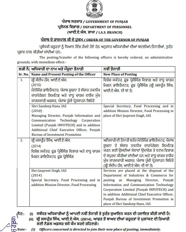 ਚੰਡੀਗੜ੍ਹ, 7 ਅਕਤੂਬਰ ; ਪੰਜਾਬ ਸਰਕਾਰ ਵੱਲੋਂ ਦੋ ਆਈ.ਏ.ਐਸ ਅਧਿਕਾਰੀਆਂ ਦਾ ਤਬਾਦਲਾ ਕਰ ਦਿੱਤਾ ਗਿਆ ਹੈ। ਇਹ ਤਬਾਦਲਾ ਚੋਣ ਜਾਬਤਾ ਲੱਗਣ ਤੋਂ ਪਹਿਲ੍ਹਾਂ ਕੀਤਾ ਗਿਆ ਹੈ।