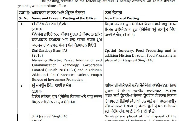 ਚੰਡੀਗੜ੍ਹ, 7 ਅਕਤੂਬਰ ; ਪੰਜਾਬ ਸਰਕਾਰ ਵੱਲੋਂ ਦੋ ਆਈ.ਏ.ਐਸ ਅਧਿਕਾਰੀਆਂ ਦਾ ਤਬਾਦਲਾ ਕਰ ਦਿੱਤਾ ਗਿਆ ਹੈ। ਇਹ ਤਬਾਦਲਾ ਚੋਣ ਜਾਬਤਾ ਲੱਗਣ ਤੋਂ ਪਹਿਲ੍ਹਾਂ ਕੀਤਾ ਗਿਆ ਹੈ।