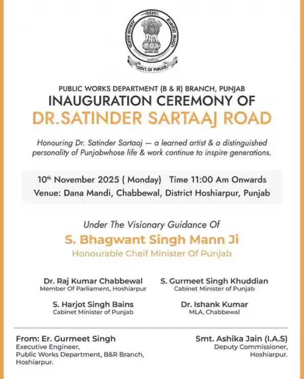 ਇਸ ਸੜਕ ਦਾ ਉਦਘਾਟਨ ਸਮਾਰੋਹ 10 ਨਵੰਬਰ 2025 (ਸੋਮਵਾਰ) ਨੂੰ ਸਵੇਰੇ 11 ਵਜੇ ਦਾਣਾ ਮੰਡੀ, ਚੱਬੇਵਾਲ (ਜ਼ਿਲ੍ਹਾ ਹੁਸ਼ਿਆਰਪੁਰ) ਵਿੱਚ ਆਯੋਜਿਤ ਕੀਤਾ ਜਾਵੇਗਾ। ਇਹ ਸਮਾਰੋਹ ਮੁੱਖ ਮੰਤਰੀ ਭਗਵੰਤ ਸਿੰਘ ਮਾਨ ਦੀ ਦੂਰਅੰਦੇਸ਼ੀ ਅਗਵਾਈ ਹੇਠ ਕਰਵਾਇਆ ਜਾ ਰਿਹਾ ਹੈ, ਜੋ ਪੰਜਾਬ ਦੇ ਕਲਾਕਾਰਾਂ ਅਤੇ ਸੱਭਿਆਚਾਰਕ ਹਸਤੀਆਂ ਨੂੰ ਮਾਣ ਦੇਣ ਦੀ ਸਰਕਾਰ ਦੀ ਨੀਤੀ ਨੂੰ ਦਰਸਾਉਂਦਾ ਹੈ।